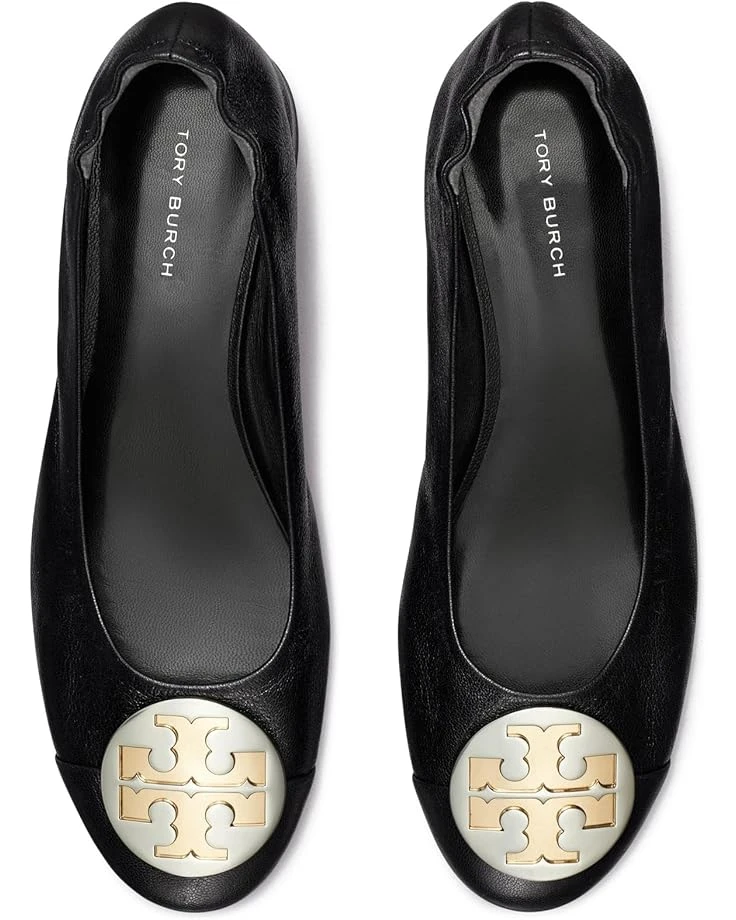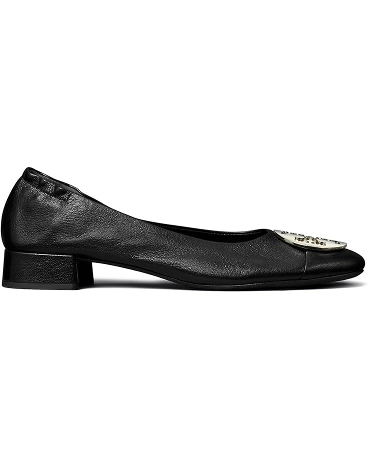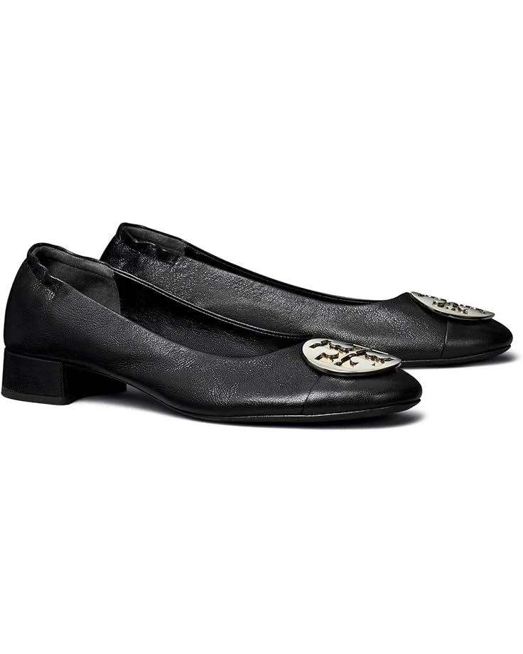 - Boasting a unique combination of a classic ballet profile with modern design cues, the Tory Burch® 25 mm Claire Heel Ballets are sure to give you a standout look. Crowned with a large metallic logo on the vamp and sculpted with a polished cap toe, the shoes exude class and elegance. These are integrated with a super-comfy, padded leather footbed and come in an easy slip-on style.