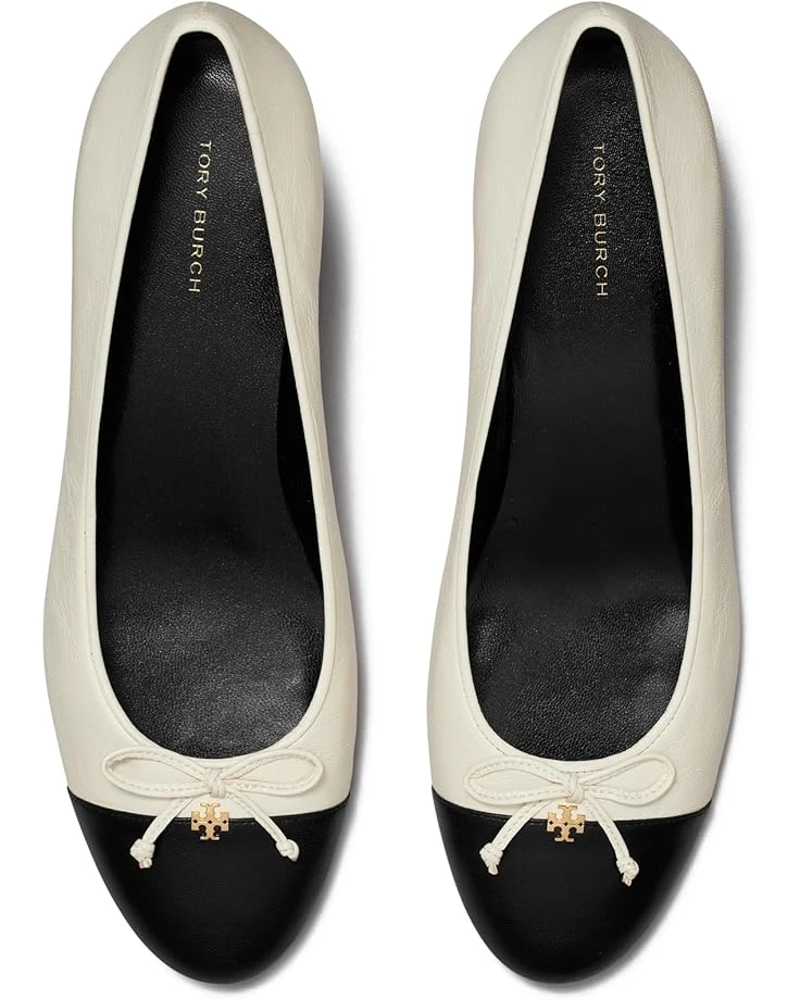 - Get that extra height in your look and walk with grace and confidence in the party donning the Tory Burch® 45 mm Cap-Toe Pumps. Highlighting a leather upper with a contrasting cap toe, a delicate bow accent, and double metallic signature motifs on the vamp, the shoes come integrated with a leather lining and a padded leather insole.