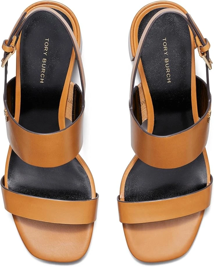 - Give importance to your feet wearing the Tory Burch® 50 mm Double T Heel Sandals. Crafted from leather upper, lining, and insole, this pair of lightweight sandals features open round toe, dual strap detailing, buckled closure, and brand detailing on the footbed.