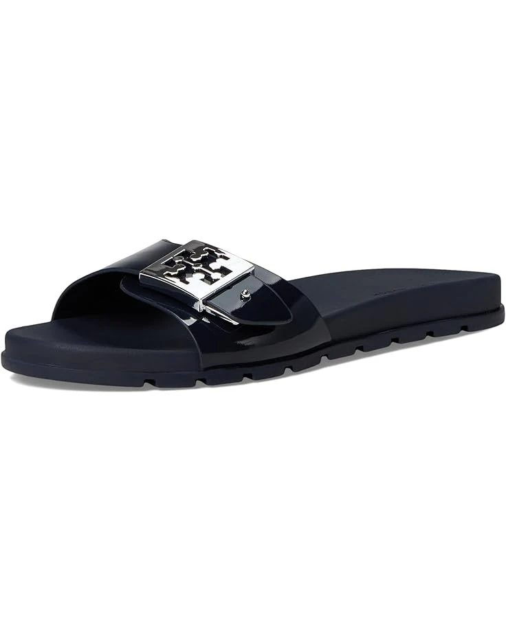 - Simple yet impressive, the Tory Burch® Buckle Slide Sandals perfectly upgrade your warm weather style without affecting your comfort game. The shoes are lightweight and water-repellent and come with a polyurethane upper accented with a plastic hinged buckle, a leather lining, and a cushioned compression-molded EVA footbed.