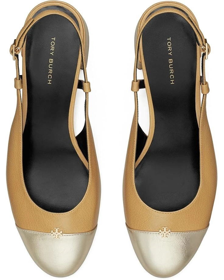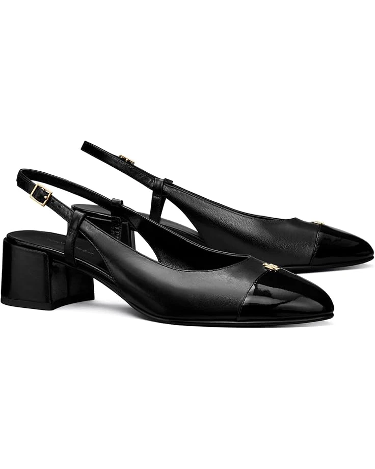 - Stay high on fashion as well as comfort donning the Tory Burch® Cap-Toe Slingback 45mm Pumps. Feminine and elegant, these shoes showcase a polished leather upper with a contrasting cap toe teamed with an iconic logo accent. With the soft leather lining and the padded leather insole, the shoes are comfortable enough for long hours of wear. Plus, the functional buckle closure on the slingback strap ensures a secure and adjustable fit.