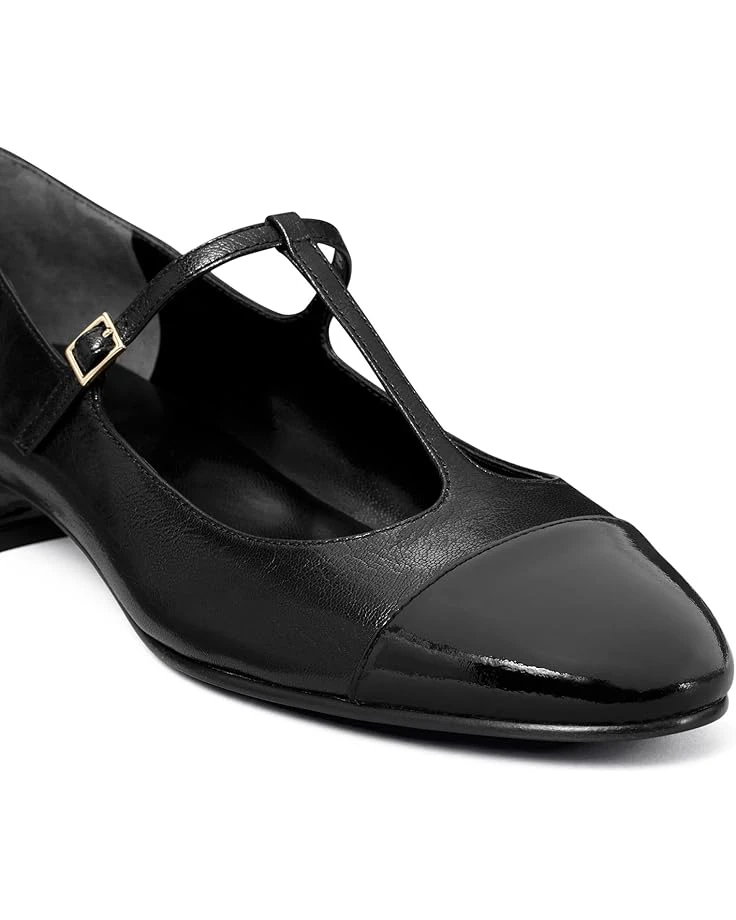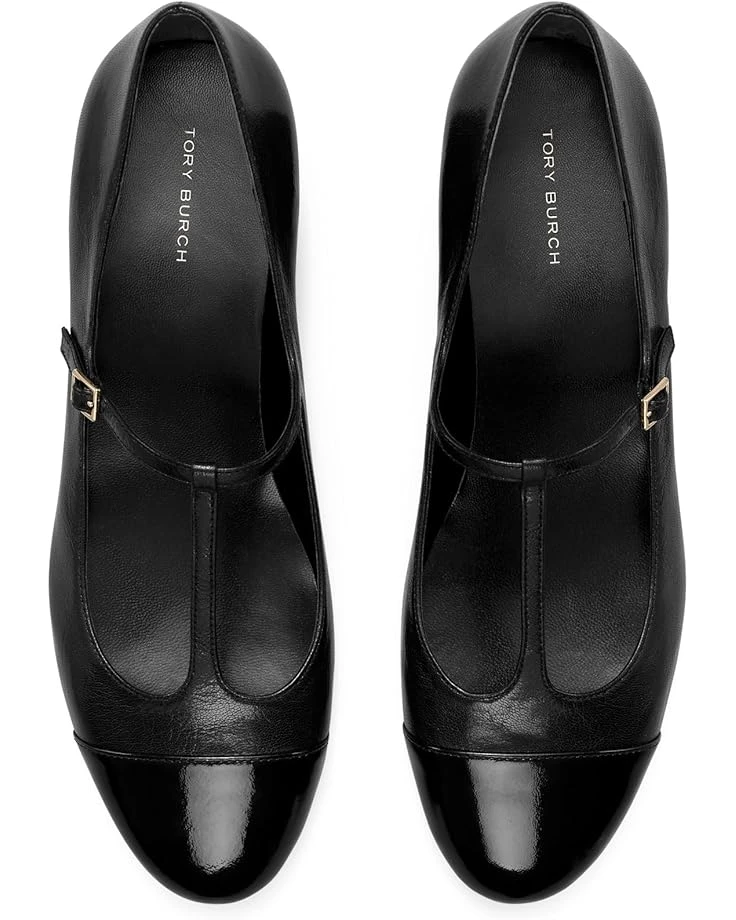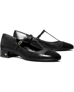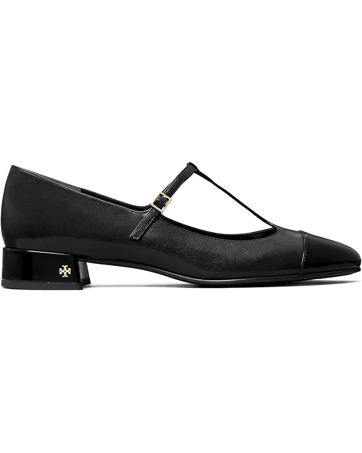 - A classic T-strap design gives the Tory Burch® Cap-Toe T Strap Ballet 25MM a modern and stylish look. The low-top footwear features stacked block heel, adjustable buckle closure, and round toe silhouette.