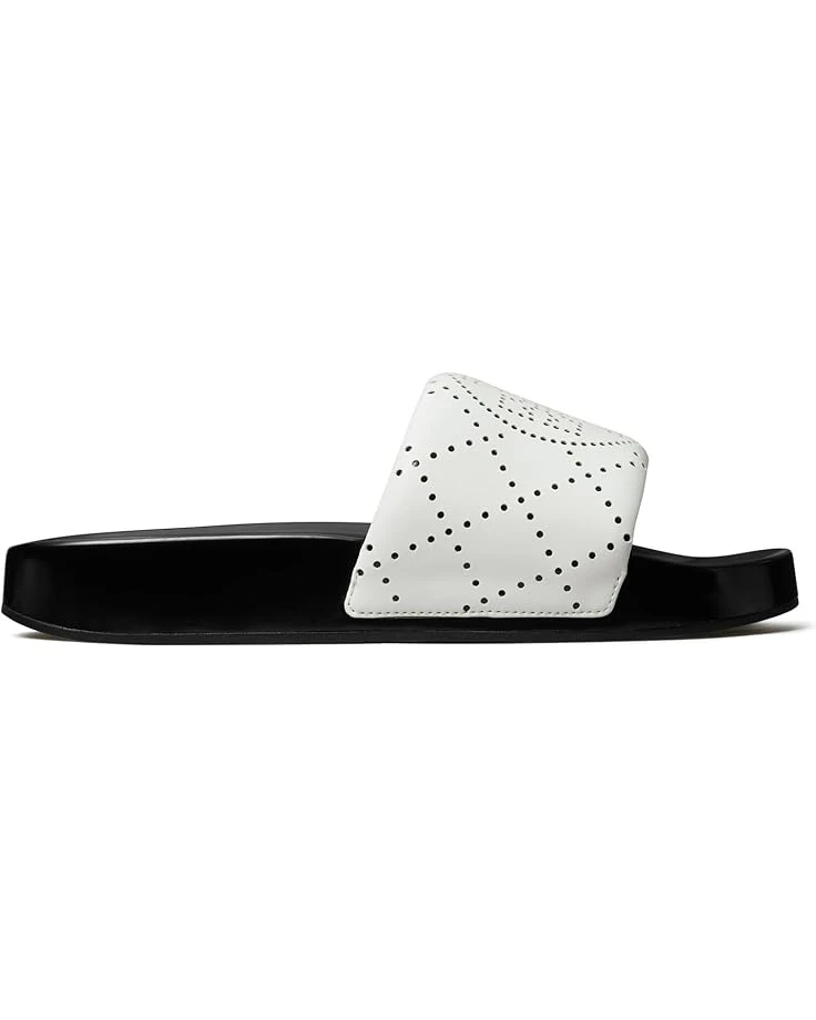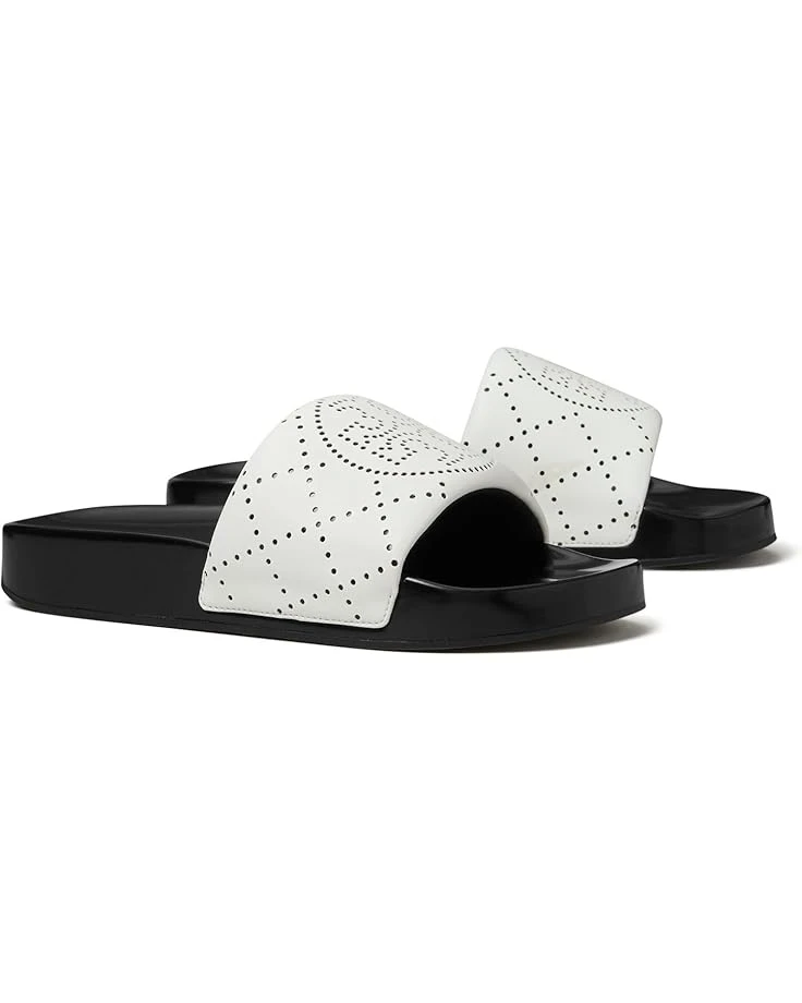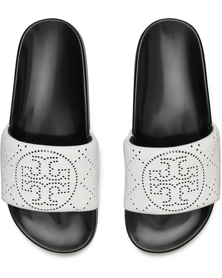 - An iconic take on the simple slip-on profile, the Tory Burch® Double T Pool Slide Sandals are something you simply cannot miss out on! Ideal for beach, pool, or city strolls, these warm weather shoes feature a polyethylene upper paired with a nylon lining and a molded leather footbed. The striking perforations on the upper showcasing the signature logo enhance the appeal of this footwear.
