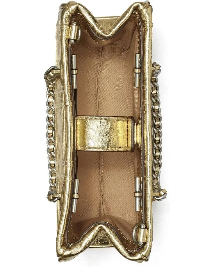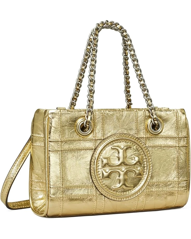 - Get maximum durability while maintaining an elegant look donning the Tory Burch® Fleming Soft Metallic Quilt Mini Chain Tote. This bag features open top with center magnetic snap strap closure, detachable shoulder strap, and one interior hanging card pocket on the back wall.
