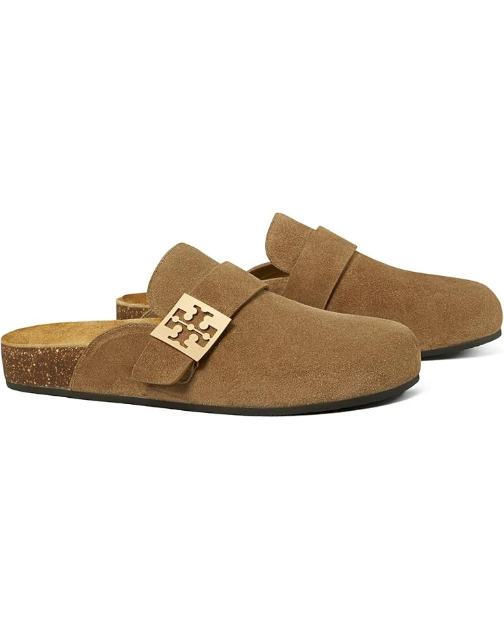 - Step out in the smart and sassy style of Tory Burch® Mellow Mules. The comfy clogs have a suede upper adorned with metal strap hardware, Napa leather lining, and a suede-covered anatomical footbed. The stylish clogs also have a slip-on closure.