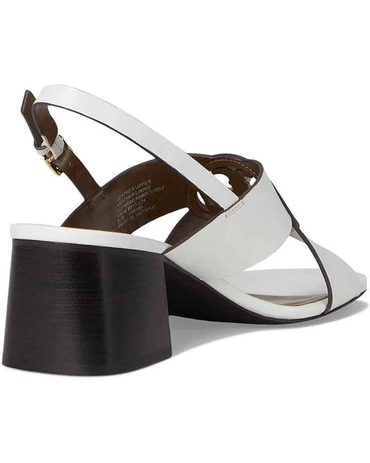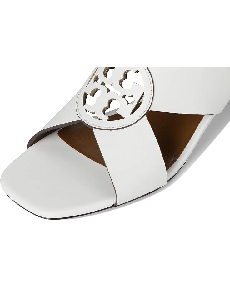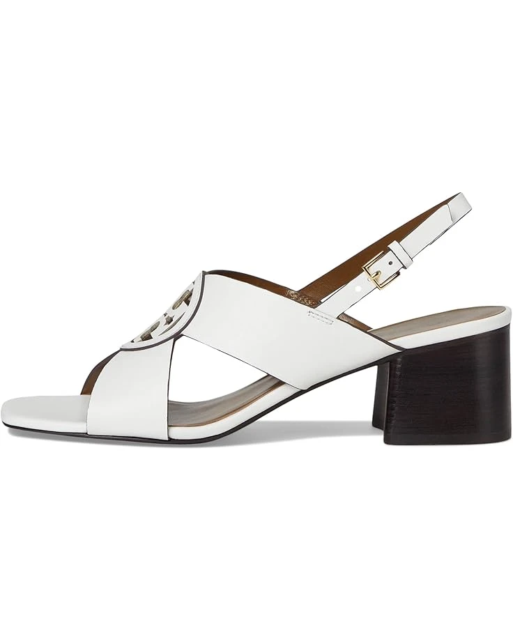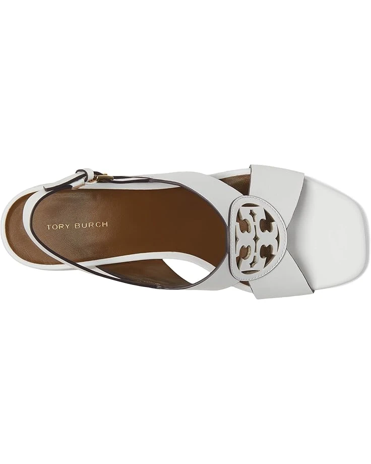 - Showcase your graceful side wearing the Tory Burch® Miller Mid Heel Sandals 55mm. Crafted from leather upper, lining, and insole, this pair of sandals features open round toe, crisscross strap design with brand logo on the top, block heel, and slingback strap with buckle closure.